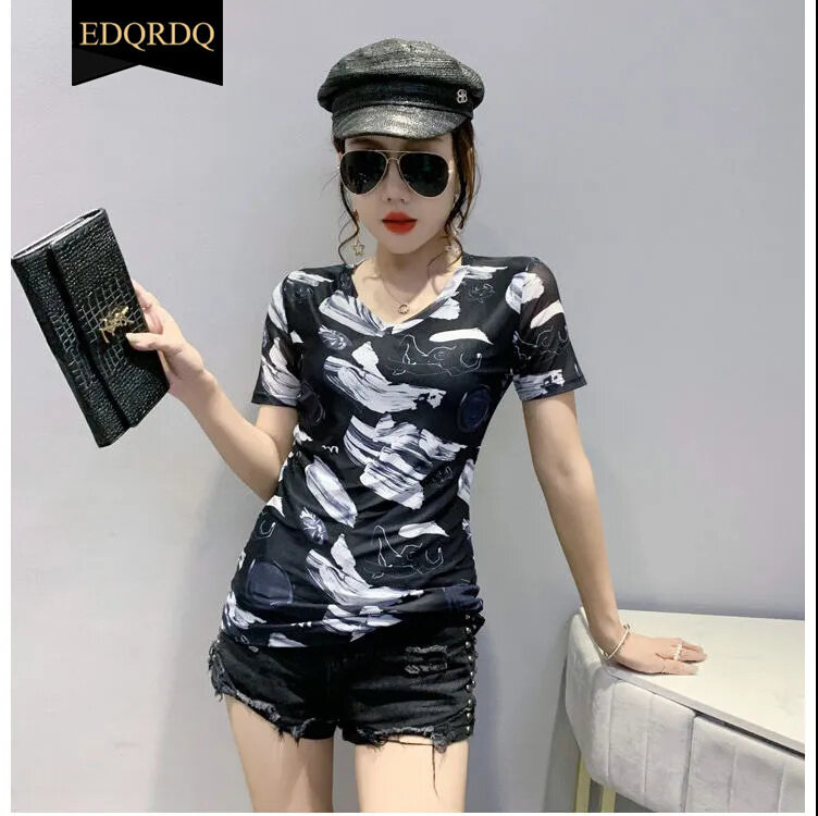 EDQRDQ Women's Short Sleeve Graphic Tee V Neck Casual Top Sheer Mesh Shirts